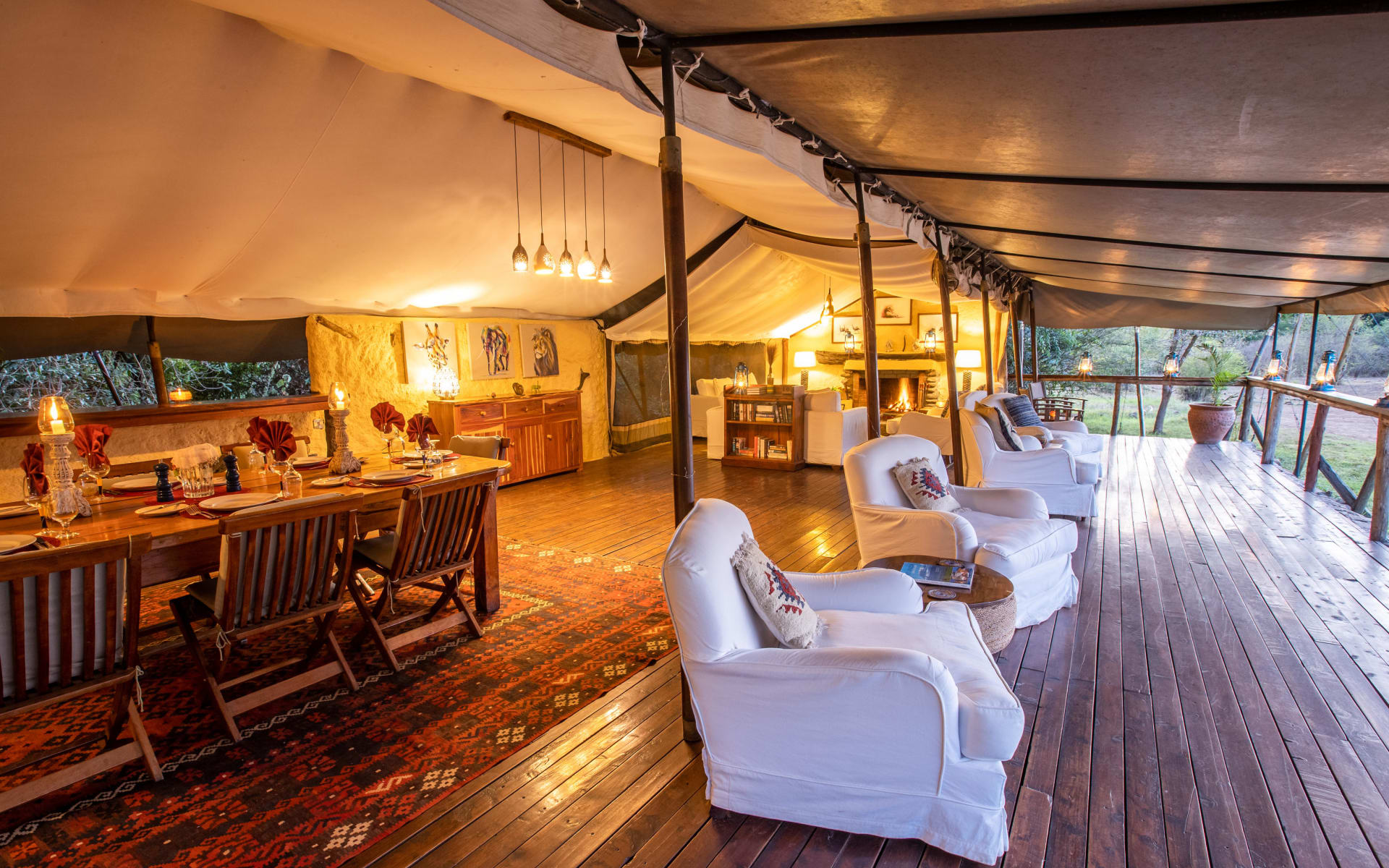 The main communal area is a great place to grab a drink and meet fellow travellers to swap safari stories. Set on a raised wooden platform is your destination for all meals in the central dining area. On one side pull up a stool at the bar the grab a cocktail, on the other nestle into the comfy couches before the fire to read your book. Whatever you may be doing keep an eye over the plains out front where animals often wander past!