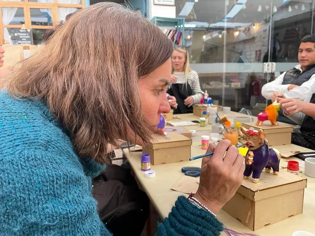 In the afternoon, we had a Cusequenian gilding workshop to attend. The workshop took place in the residential outskirts of the city, and our hosts introduced us to Totemiq which works in collaboration withFlorencia y Fortunata. We received a Torito de Pucara ceramic (a symbol of prosperity) with supplies inside an MDF box to get started in decorating our bulls. We learnt about the syncretism of Andean culture with Spanish influences, and we also heard about initiatives to support local women artists which we’d be contributing towards by participating in the workshop. We drank locally brewed coffee and honestly, this was the most relaxing activity - a haven in the city for those who want to relax after adventures in the Andes.